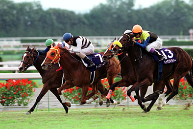 折しも、紅葉日和の京の都、華やかにいざスタート!! きれいなスタートを見せました。 外からヤマカツスズラン、ポイントフラッグ、 内からテイエムオーシャンは、あまりいいスタートではありませんが、 ローズバドは、もうシンガリまで下がっています。 先頭にヤマカツスズランが立ちます。 予定通り池添謙一が14頭を引っ張る格好になっています。 トゥザヴィクトリーは行きません。 トゥザヴィクトリーは中団だ。そしてローズバド、 ご覧のようにインコース。シンガリからレースを進めてまいります。 先頭にはヤマカツスズランが立っています。 2番手には赤い帽子のタイキポーラ。 テイエムオーシャンは3番手のインコースであります。 ティコティコタックが中団、トゥザヴィクトリーはその後ろ、 レディパステルも中団です。そしてシンガリから2番のローズバドの 展開で、さあ1コーナーから2コーナーに向います。 まもなく向う流しに入ります。 先頭はヤマカツスズランで体半分のリード。 タイキポーラが2番手に続いています。そして3番手でありますが、 差があって1番のテイエムオーシャンであります。 それから2馬身の差があってポイントフラッグ、 内3番のスプリングチケットであります。 さあまもなくスタートして千の標識、今通過!!58秒です!! やや早い流れになっている。マイニングレディがいる、 メジロサンドラがいる、7番がティコティコタックであります。 そして11番レディパステルと蛯名はインコースぴったり。 その後ろトゥザヴィクトリー、内から8番カリスマサンオペラ、 そしてマルカキャンディであります。 その外を通ってタフネススター3連勝中。2番のローズバド、 シンガリの位置から10番の、10番のスリーローマンで、 さあ坂を上る、下りにかかって半マイル。前2頭はとばしている。 先頭は15番のヤマカツスズラン。 2番手にタイキポーラ、2番手タイキポーラ。 そしてテイエムオーシャンは、じっくりと3番手。 本田がじっくりと今3番手。その外へポイントフラッグであります。 さあその後ろからメジロサンドラ、スプリングチケット、 そしてローズバドはどうしているか。 ようやく今ティコティコタック、ティコティコタック6〜7番手に 上がってくる。その後ろからトゥザヴィクトリー、レディパステル、 ローズバドはインコースへ入ってきた。 先頭はまだヤマカツスズラン、池添が、逃げる、逃げる、逃げる、 外からテイエムオーシャン、外からテイエムオーシャン!! 大外からポイントフラッグ、真ん中からトゥザヴィクトリー!! 真ん中トゥザヴィクトリー!!内からティコティコタックだ!! テイエムオーシャン先頭、内からレディパステル、大外からローズバド!! トゥザヴィクトリー先頭!!内からティコティコタックぅ〜!! ティコティコタックか!!トゥザヴィクトリーか!! ローズバドぉっ!! きわどいっ!! トゥザヴィクトリー、ローズバド、ティコティコタック!! ゴール前、激しい競馬になりました!! 実に激しい競馬になりました!! 真ん中トゥザヴィクトリーか、外から伸びたローズバドか!! あるいはインコースから来たティコティコタックか!! テイエムオーシャンは、ちょっと態勢が悪かったか!! 非常にきわどい競馬になっています。 古馬が古馬が意地を見せました。3歳3人娘の決着にはなりませんでした。 まだ着順掲示板は挙がってません。勝ち時計は2分11秒2、 ヤマカツスズランが早い流れを演出しています。 予想以上に早い流れになりました。 【2001年11月11日、実況:馬場鉄志アナ】