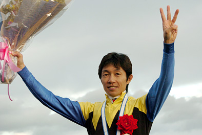 3000メートルの先に、栄光の瞬間が待っています。 新しい歴史の扉が開かれようとしています。 テレビの前の貴方も歴史の目撃者です!!ゲートインが終わりました。 いざ!!(ガコーン!!)いまスタート!! ディープインパクト上手く出ました。今日は上手く出たディープインパクト。 綺麗なスタートを切りました。まず染め分け帽が行きます。 内からアドマイヤジャパン、それをかわして約束通りシャドウゲイトが逃げます。 アドマイヤジャパン2番手、ピサノパテック3番手。 内へコンラッド、それからローゼンクロイツ早めに行っている。 安藤勝己5番手、それからフサイチアウステルであります。 そして5番のアドマイヤフジ。この後ろにディープインパクト。 さあ、折り合いをつけたい武豊。 その外へピッタリとディーエスハリアーであります。 11番がシックスセンス。その後ろマルブツライトが続いている。 あと後ろ4〜5頭は9番のエイシンサリヴァン。そして2番のヤマトスプリンター、 その外へ10番のレットバトラーが続いている。ミツワスカイハイ、 シンガリからマルカジークの展開で、1周目の植え込みを回りまして、 さあ、13万人を超えるスタンド前、大歓声が起こるスタンド前、 シャドウゲイトが引っぱる形になりました。ディープインパクトは内へ入れている。 懸命に武豊、長手綱で、ディープインパクトをいさめるような感じ、鎮めるような感じ、 前半の千を1分1秒で通過している。ディープインパクトは1分3秒台で通過しています。 ゴール板を通過しました。天蓋の菊の前、先頭はシャドウゲイト、 ディープインパクト、思いのほか、思いのほか、前に行っている。 その前に宿敵ローゼンクロイツ、ディープの後ろにはシックスセンス。 斜め前方にはフサイチアウステル、藤田伸二が控えています。 さあ、ディープインパクト、中団のインコースで、1コーナーから2コーナーへ このあたりから例年、流れが落ち着く展開になります。先頭はシャドウゲイト、 そして2番手でありますが、染め分け帽のアドマイヤジャパンであります。 アドマイヤジャパン2番手、馬群差がついた、ピサノパテック3番手、 ローゼンクロイツ4番手、内へコンラッド、フサイチアウステル、 さあ、その後ろディープインパクト!!向う流しに入っている。 手綱を通して血が通う、武豊とディープインパクト、お互いを信じ切って、 さあ、どこから行くか!!ディープインパクト中団です。 スタート地点を通過して、さあ、これからいよいよ第3コーナーの勝負どころ。 ディープの後ろにアドマイヤフジが控えている。ディーエスハリアー、 そしてシックスセンスがいます。その後ろからマルブツライト。 ご覧のような展開で3コーナーの坂に向かいます。 シンザンが、ルドルフが、そしてブライアンが辿った3冠への道。 ディープインパクト、ご覧のように坂の頂上で非常にいい感じ、武豊。 800の標識を過ぎて坂を下る。 先頭は依然として、先頭は依然として、8番のシャドウゲイト、 2番手、2番手にアドマイヤジャパン、アドマイヤジャパン2番手。 ディープインパクト、さあ、そろそろ行くかなぁ〜!! 武豊、ローゼンクロイツの外へ、フサイチアウステル、 その外からディープインパクト、その外からディープインパクト!! 14万人近い大歓声が起こった!!逃げ込みをはかるのはアドマイヤジャパン!! 横山典弘、逃げる、逃げる!!そしてローゼンクロイツ!! 一番外から、一番外から、ディープインパクト!!ムチが入った武豊!! とらえた!!とらえた!!とらえました!! あと100メートル!!アドマイヤジャパン粘る!! しかし、先頭はディープインパクトだ!! 世界のホースマンよ見てくれ!!これが日本近代競馬の結晶だ!! ディープインパクト〜〜〜!! 大外から脚音も軽やかに、ディープインパクトと武豊〜〜〜!! 3冠達成!!勝ち時計は3分4秒6、実に21年ぶりシンボリルドルフ以来、 無敗の3冠馬の誕生であります!!ディープインパクト7戦7勝です!! 期せずして場内から大きな拍手が起こりました!! まさに、日本競馬史に残る1ページ、一瞬であります。ディープインパクトと武豊、 向う流しに入って、これからあるいはウイニングランを行うんでありましょうか。 いま馬を止めます。上がり3ハロンが35秒7、今日は神戸新聞杯よりも、 ゆっくりと仕掛けたような、そんな感じになったんでありますが、 しかし、最後はキッチリと、逃げ粘る横山典弘のアドマイヤジャパンを とらえています。緑の芝馬場に青い花が咲きました。 菊の大輪を頂いたディープインパクトと武豊であります。 勝ち戻りますディープインパクト、さらに、また大きな歓声が起こっています。 父サンデーサイレンス、母ウインドインハーヘア、母の父がAlzao。 金子真人さんの持ち馬。池江泰郎厩舎の所属馬であります。 武豊騎手。北海道の早来ノーザンファームの生産馬。 ノーザンファームはクラシック競走、これで7連勝ということになりました。 偉大な記録を残しましたディープインパク